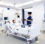 Safety alerts: Brake unlocked indicator, siderail unlocked, lowest bed position, out-of-bed position warning